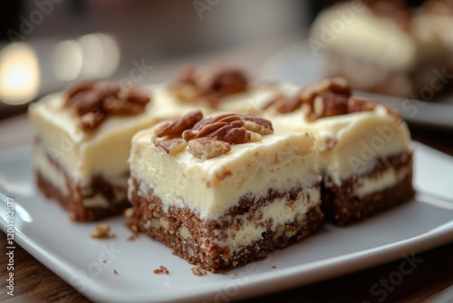 Multiple pieces of Hummingbird Cake with Cream Cheese Frosting and Caramel Nut on a white plate captured from eye level with a bokeh effect