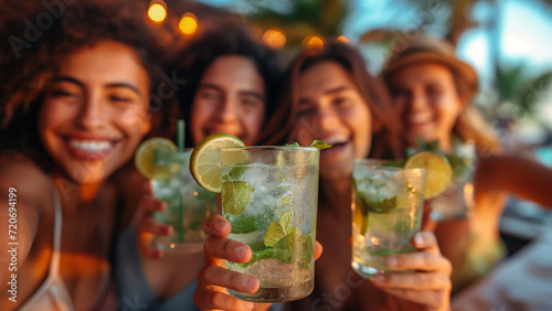 Multiracial friends enjoying happy hour toasting fresh mojito cocktails at open bar - Happy group of young people celebrating summer party together