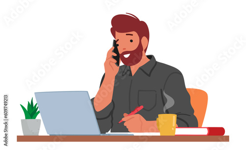 Multitasking Professional Male Character. Man Effortlessly Manages Work On His Laptop While Handling A Phone Call
