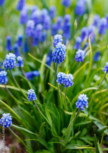 Muscari flowers, Muscari armeniacum, Grape Hyacinths spring flowers blooming in april and may. Muscari armeniacum plant with blue flowers
