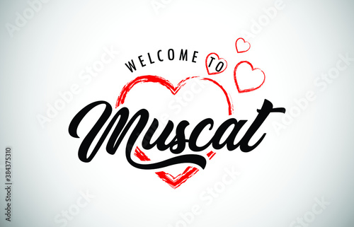 Muscat Welcome To Message with Handwritten Font in Beautiful Red Hearts Vector Illustration.