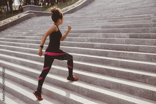 Muscle training. Fashion african american girl in sportswear with headphones and fitness tracker runs along city stairs, copy space
