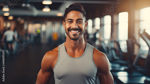Muscular arabian man in sportswear, smiling and looking at the camera on the background of the gym. Personal trainer. The concept of a healthy lifestyle and sports.