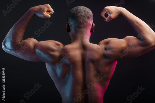 Muscular male African bodybuilder in Back double biceps position, over dark background. Back view.