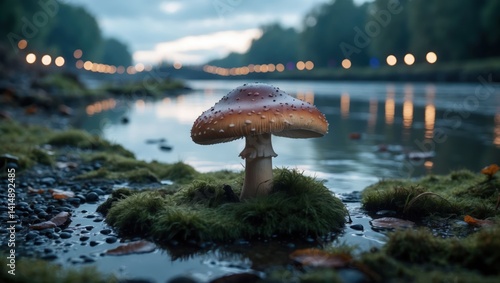 Mushroom Growing Near Water at Dusk Reflecting Lights in Water