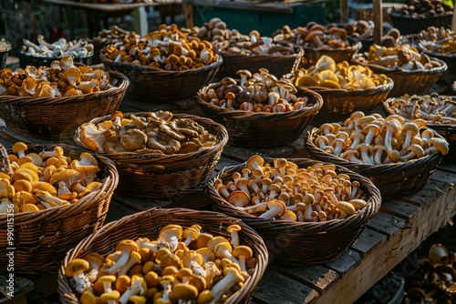 mushroom, basket, harvest, food, fresh, edible, fungal, nature, autumn, fall, organic, farm, market, rustic, wild, natural, brown, yellow, epicure, wood, table, display, seasonal, delicious, tasty, healthy, vegan, vegetarian, foraging, mycology, agriculture, cultivation, oyster, chanterelle