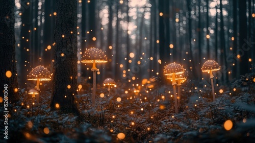 Mushrooms glow softly in a forest at dusk creating a magical atmosphere among the trees