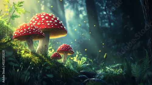 Mushrooms growing in a dark forest surrounded by shadows and greenery in a mysterious natural environment. Mysterious Spores. Illustration