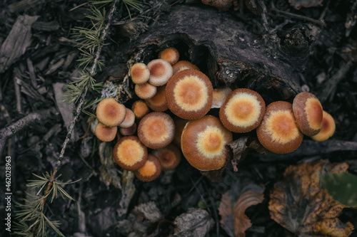 Mushrooms in autumn forest sunlight green grass yellow and orange colors