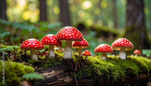 Mushrooms with red caps, green moss in forest. Natural scenery.
