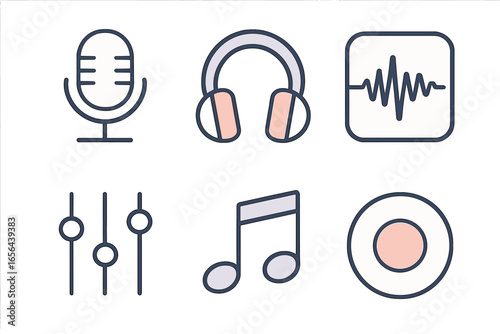 music, audio, set, icon, sound, microphone, earphones, note, wave, icon, collection, symbol, graphic, design, media, recording, broadcasting, podcast, dj, studio