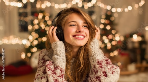 missy, teenage, girl, earphones, music, christmas, festive, holiday, celebration, happy, joyful, smiling, cheerful, relaxed, listening, tune, living room, home, decoration, cosy, atmosphere, background, interior, domestic, room, light, ornament, garland, tree, seasonal, happy holiday, teenage girl, holiday spirit, lass, christmas lights