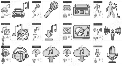 vector, graphic, illustration, design, drawing, hand-drawn, draw, icon, isolated, background, black, line, flat, minimal, linear, scalable, set, white, media, technology, cyberspace, radio, microphone, audio, network, digital, music, note, listening, record, player, wave, service, global, connection, retro, social, wireless, computer, cloud, computing, upload, car, singer, download, vinyl, hearing, loudspeaker