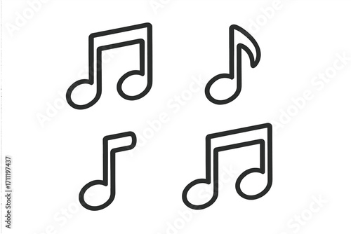 Music note icon set. Vector linear audio symbols. Melody, song, rhythm. Listen to music concept. Black isolated quaver musical note graphics. Minimal flat design element.