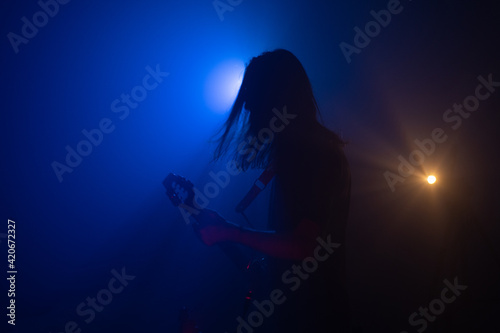 artist, blue, concert, dark, electric, electronic, fog, guitar, indoor, live, man, music, musician, people, performance, performer, player, playing, silhouette