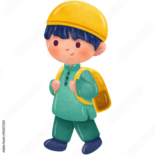 muslim, boy, wearing, bag, watercolor, student, education, islamic, isolated, arabian, people, happy, smile, son, male, islam, illustration, cute, cartoon, young