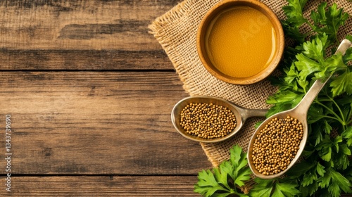 Mustard Seed and Oil Composition Rustic Wooden Background, Spoons, Parsley, Overhead Shot, Food Photography, Culinary Herbs Mustard Seeds, Oil