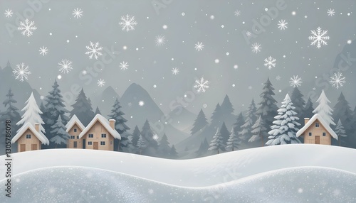 Muted White Background with Wooden Cabin and Snowflake Patterns