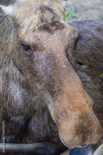 Muzzle of a moose with a sad expression of eyes in brown wool close-up