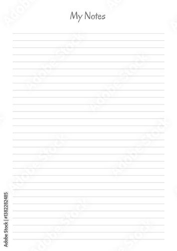 MY NOTES blank sheet of paper with straight parallel lines on white isolated background. Vector illustration.