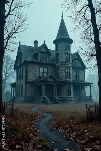 Mysterious Abandoned Victorian Mansion Shrouded in Mist, Decaying Facade, Overgrown Vines, Perfect for Horror, Thriller, Mystery Film Projects