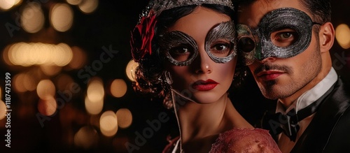 Mysterious and elegant couple in ornate Venetian style masks attending a lavish high society masquerade ball The opulent attire decorative masks and formal setting evoke a sense of luxury tradition