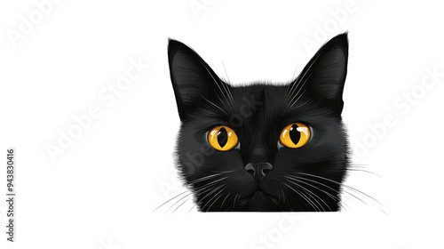 Mysterious Black Cat with Glowing Yellow Eyes on White Background