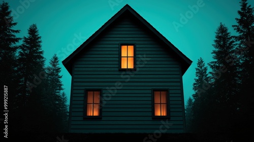 cabin, wood, forest, moonlight, night, dark, window, light, glow, mystery, skittish, eerie, haunted, scarey, horror, silhouette, tree, pine, evergreen, nature, rural, isolated, ambience, atmosphere, scenic, landscape, moody, dramatic, cinematic, dark blue, teal, blue, green, orange, yellow, house, bungalow, farmhouse, home, residence, building, structure