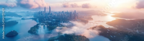 Mysterious City Emerging from the Misty Waters of a Foggy Lake Enveloped in Ethereal Atmosphere Creating an Enigmatic and Dreamlike Scene