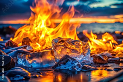 ice, flames, contrast, nature, element, beauty, fire, cold, temperature, abstract, visual, landscape, environment, creativity, texture, vibrant, colours, surreal, dramatic, warmth, chill, dynamic, artistic, mystical, energy, transformation, fusion, phenomena, atmospheric, scenery, seasonal, harmony, captivating, enchanting, striking, aethereal, unique, polar, heat, cool, natural, photo, stunning, breathtaking, aesthetic, scenic