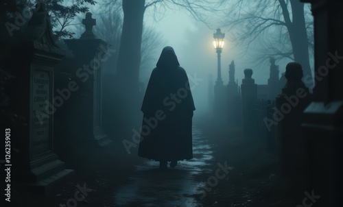 cemetery, mystery, fog, dark, silhouette, cloak, street light, eerie, skittish, night, tree, landscape, shadow, path, cemetery, gothic, moody, ominous, haunting, tranquil, nature, urban, cold, stillness, serenity, lonely, atmospheric, ghostly, whimsical, darkness, mood, mystical, gravestone, mist, unknown, abandon, spirit, foreboding, enchanted, night time, night sky, aethereal