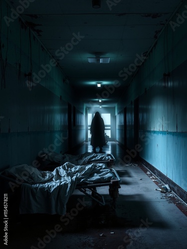 Mysterious Figure in Dimly Lit Abandoned Hospital Corridor