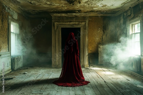 mysterious, figure, red, cloak, fog, abandoned, room, distressed, wall, natural, light, streaming, window, solitude, shadow, eerie, atmosphere, haunting, photo, decor, aethereal, isolation, cinematic, dramatic, composition, stillness, space, indoor, mist, ghostly, fashion, fabric, silence, portrait, beauty, artistic, creative, storytelling, optical, mystery, elegance, enchantment, depth, emotion, narrative, surreal, vintage, element