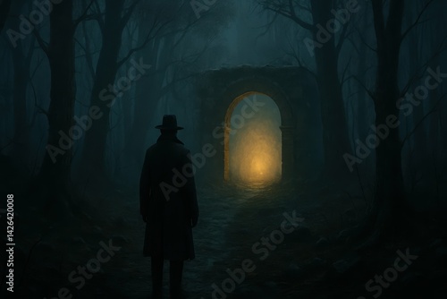 mysterious, figure, portal, forest, night, light, shadow, silhouette, fog, darkness, eerie, landscape, adventure, exploration, mystique, solitude, unknown, atmosphere, cinematic, nature, wood, illuminated, stone, archway, haunting, enchantment, intrigue, suspense, journey, discovery, path, enchanted, visual, element, surreal, dreamlike, ambience, magic, storytelling