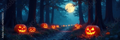 Mysterious forest path illuminated by glowing jack-o-lanterns and a full moon overhead, forest floor, lanterns, magical