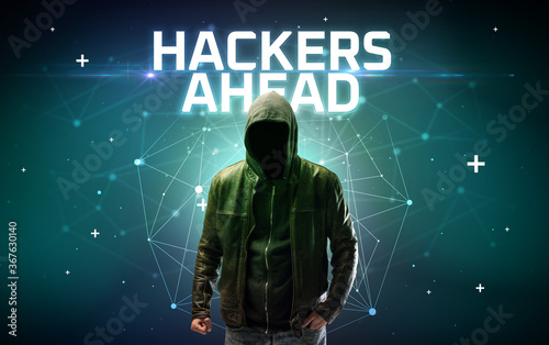 Mysterious hacker with HACKERS AHEAD inscription, online attack concept inscription, online security concept