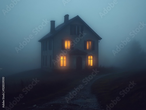 house, fog, night, mysterious, glow, window, eerie, dark, skittish, atmospheric, landscape, scenery, architecture, rural, path, light, nature, silhouette, abandoned, creepy