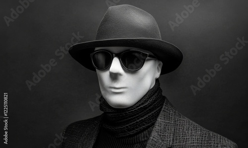 Mysterious Invisible Man with Hat and Sunglasses in Dramatic Lighting, Noir Fictional Character Concept for Suspense and Mystery Themes, Black and White Photography, Generative AI