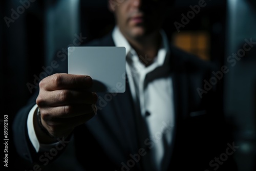 blank card, dramatic, suit, intrigue, mystery, sharpened, closeup, businessman, identity, anonymous, concept, suspense, dark background, hand, gesture, blank, minimalist, secrecy, unknown, professional, serious, shadow, moody, abstract, presentation, business, authority, anonymity, intense, enigmatic, copy space, message, placeholder, marketing, dark, reveal, conceal, card, clean, isolated, object, 1, looking, paper, holding