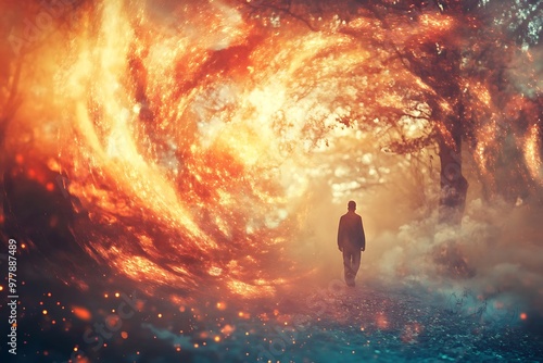 man, walking, portal, fire, forest, fantasy, magical, surreal, mysterious, silhouette, adventure, dream, imagination, concept, art, digital artwork, hallucinogen, abstract, journey, path, light, dark, shadow, tree, nature, spiritual, mystic, escape, hope, fear, danger, unknown, belief, mystery, wonder, weird, enchanted, enchanting, futuristic, futurism