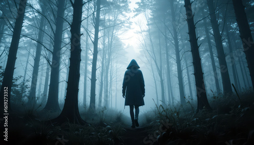 forest, fog, dark, person, hood, mysterious, night, tree, silhouette, alone, nature, mist, pathway, shadow, wilderness, cold, eerie, atmosphere, outdoors, timberland, foggy, solitude, quiet, blue, chilling, adventure, exploration, misty, tranquil, forest floor, natural