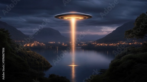 Mysterious UFO beams light from tranquil lake in mountainous New Africa under a starry night sky
