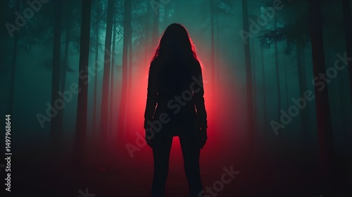 Mysterious Woman Stands Alone in Dark Foggy Forest Lighting Effects