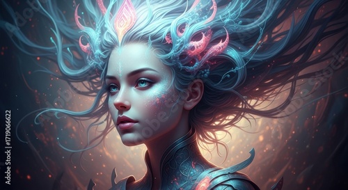 woman, aethereal, cosmic, mysterious, fantasy, portrait, beauty, glistering, sparkle, stardust, nebula, space, enchanting, dreamlike, intricate, detailed, artistic, illustration, digital artwork, science fiction, surreal, glowing