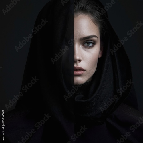 mysterious, woman, portrait, hidden, veil, dark, face, secret, unknown, identity, expression, beauty, dramatic, shadow, elegant, secrecy, black, enigmatic, emotion