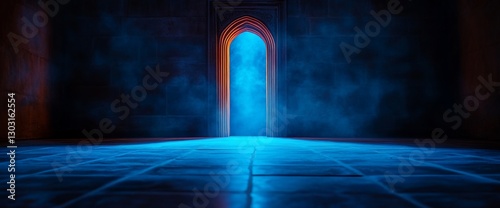 architecture, arch, interior, dark, light, glowing, doorway, mystic, ancient, stone, room, hallway, blue, orange, fog, smoke, illumination, design, modern, empty, scene, background, texture, geometric, pattern, tile, floor, space, fantasy, virtual, three-dimensional, graphic, render, visualisation, creative, artwork, photorealistic, illuminated, photo, lighting, composition, art