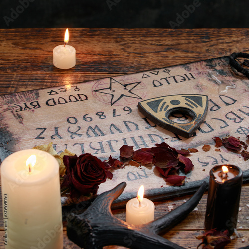 Mystic ritual with Ouija and candles. Devil's board concept, black magic or fortune telling rite with occult and esoteric symbols.