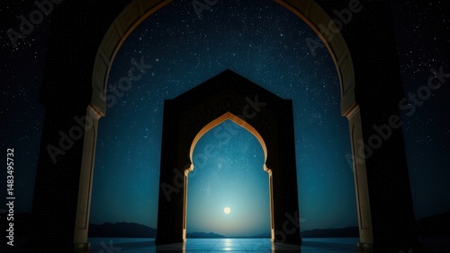 Mystical Archway Under a Starry Sky: Tranquil Coastal Scene with Moonlight