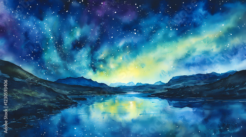 mystical, aurora, borealis, up high, glacial, high-coloured, watercolor, streak, starry, night, sky, lagoon, illustration