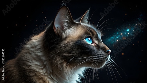 cat, mystical, blue eye, felino, digital artwork, fantasy, magical, animal portrait, whisker, fur, artistic, surreal, enchanted, pet, vibrant, luminescent, mysterious, illuminated, artwork, dark background, dreamy, sparkling, majestic